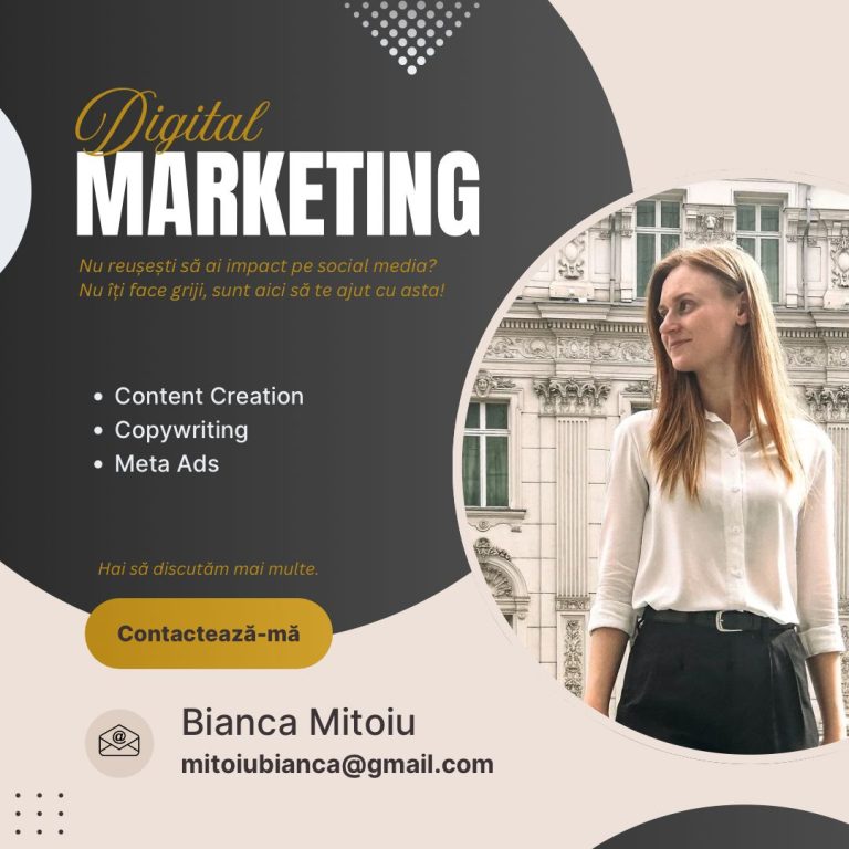 Sunt Bianca, copywriter și digital marketer și stau la dispoziția ta, pentru ca visul tău să devină o afacere de succes. Tot ce trebuie sa faci, este să-mi prezinți ideea ta, iar eu o voi transforma într-un conținut care nu va trece neobservat. Și pentru că autenticitatea este cheia succesului în promovarea oricărui business, mă voi asigura că totul va decurge conform valorilor și dorințelor tale, într-un mod care să capteze atenția întregului public.